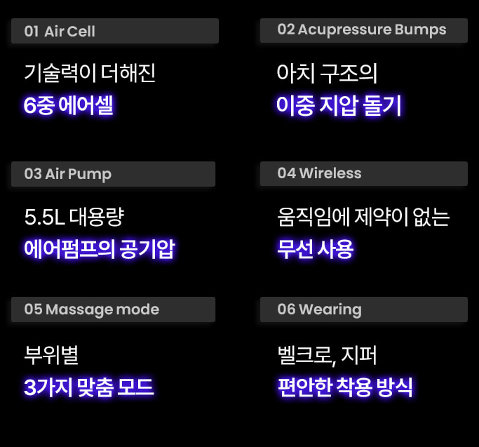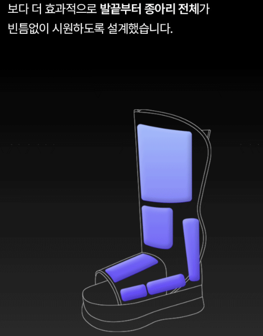 6중 에어셀은 다리의 각 부위를 효과적으로 압박하면서, 발바닥부터 종아리까지 깊은 마사지 효과를 제공합니다. 이 에어셀들이 발과 종아리를 감싸며 일으키는 압박은 강력하지만 부드럽게 발의 피로를 풀어주고, 발바닥의 지압을 효과적으로 해주죠.