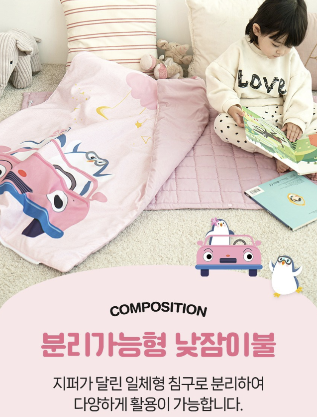 일체형 디자인으로 이불과 베개가 함께 있어, 아이들이 자는 동안 불편함 없이 잘 수 있어요.