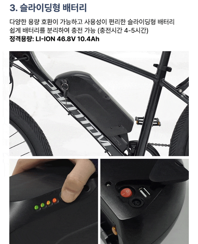배터리는 슬라이딩형으로 되어 있어서 간편하게 분리하고 충전할 수 있어요. 자전거에 배터리가 붙어 있으면 충전 시 불편할 수 있는데, 슬라이딩형 배터리는 그런 걱정을 덜어줍니다. 배터리만 쉽게 분리해서 실내에서 충전할 수 있죠. 👌