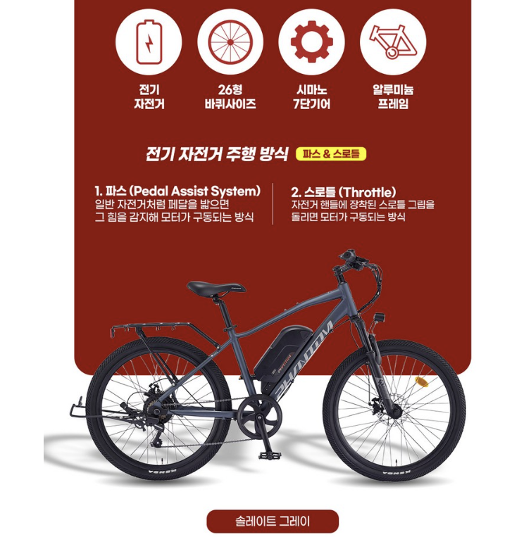 삼천리 전기자전거 25년 26형 팬텀TX 산악형하이브리드 출퇴근 - 전기자전거 | 쿠팡