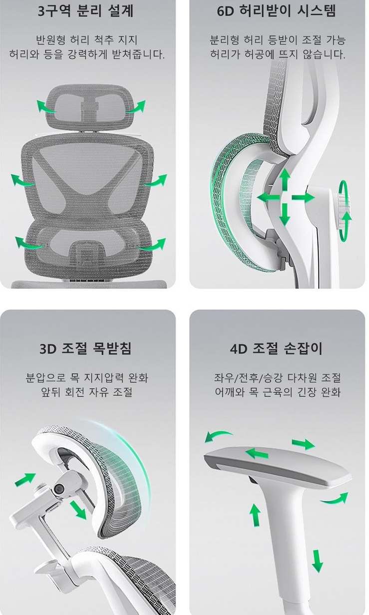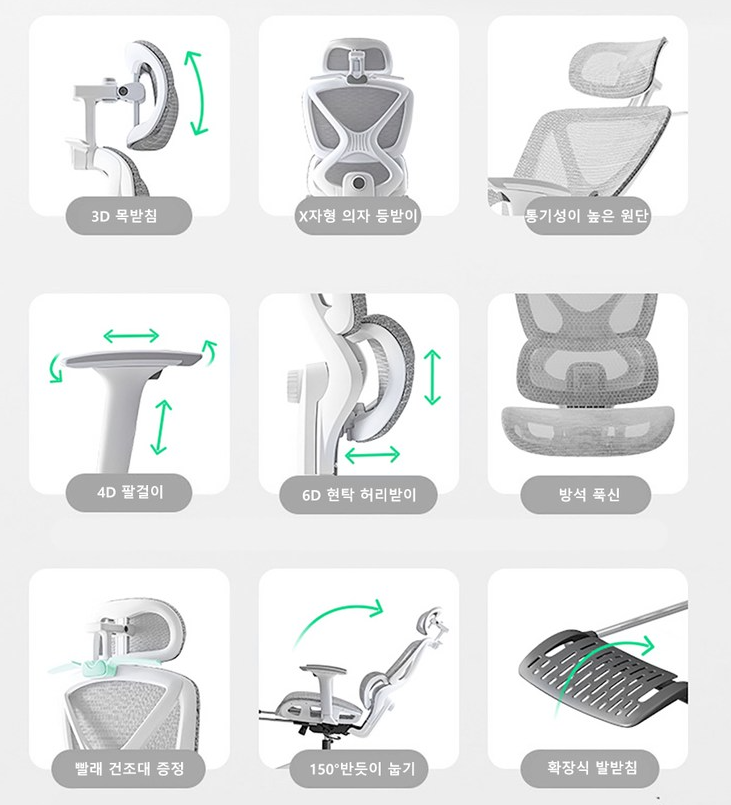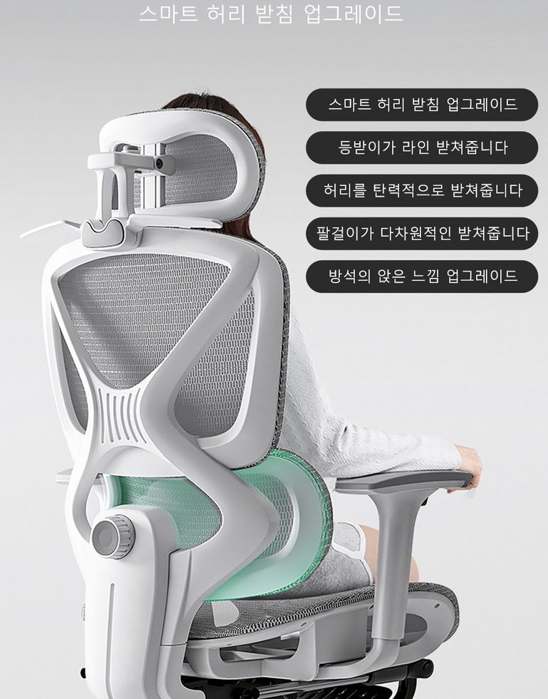 이 의자는 3D 요추 허리받침을 제공하여, 허리의 곡선을 자연스럽게 지지해줍니다. 허리의 부담을 덜어주는 것은 물론, 장시간 앉아 있어도 허리가 뻐근해지지 않아요. 😌