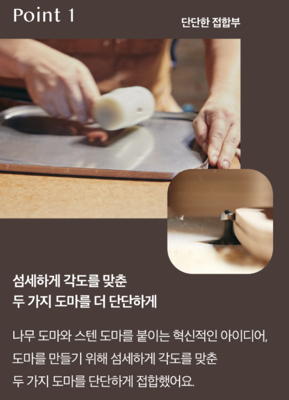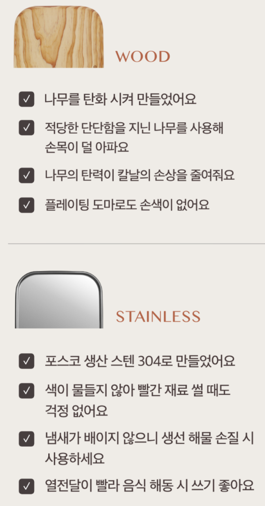 - 세척 용이: 스테인레스 면은 세척이 쉽고, 나무면도 오랫동안 깨끗하게 유지할 수 있어 관리가 간편해요.