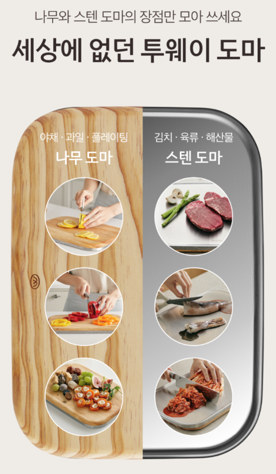- 투웨이 도마: 양면을 모두 사용할 수 있는 도마입니다. 한쪽은 스테인레스, 다른 한쪽은 나무로 되어 있어 상황에 맞게 사용할 수 있어요.