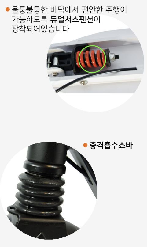 거친 도로나 울퉁불퉁한 길도 쉽게 지나갈 수 있어요. 그만큼 오래 타도 피로감이 덜하고, 편안하게 즐길 수 있어요!