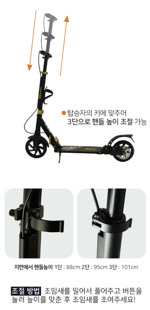 매트릭스 킥보드는 성인뿐만 아니라 청소년까지 모두 사용할 수 있도록 설계되어 있어요. 다채로운 조절 기능 덕분에 키에 맞게 조정이 가능해요.