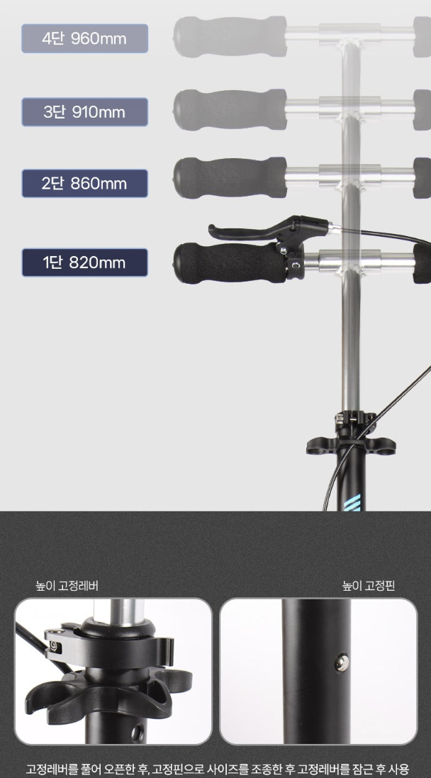 이 킥보드에는 높낮이조절기능이 있어요. 사용자마다 다르게 키에 맞춰 손잡이의 높이를 조정할 수 있어요. 👌