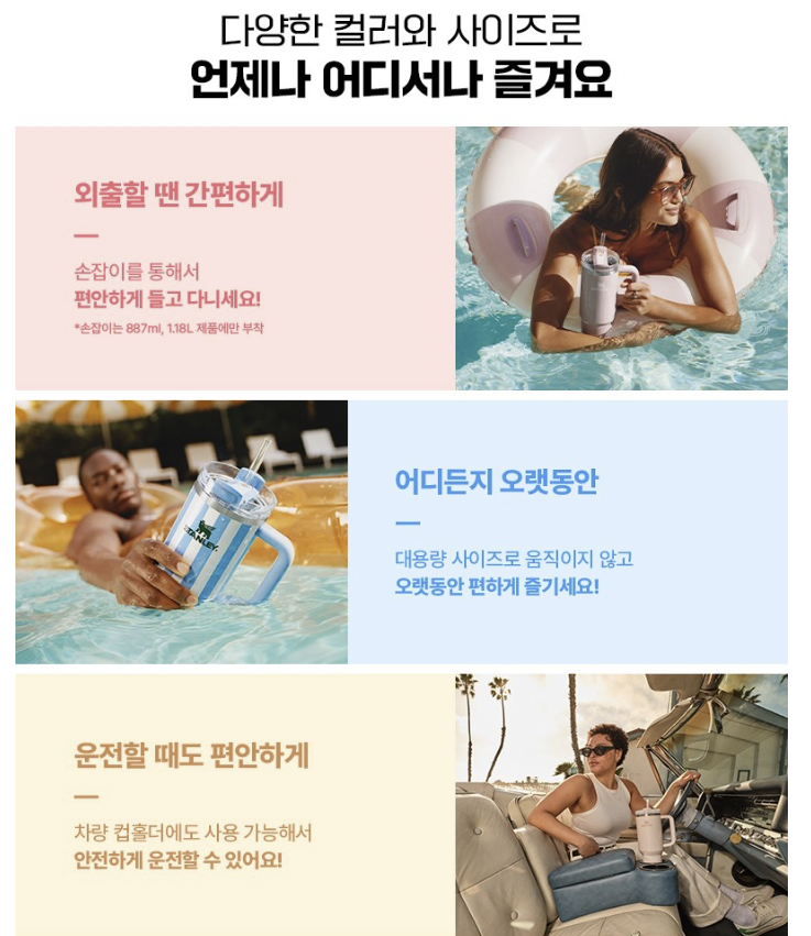 다양한 컬러와 사이즈로 내 취향을 만족시키면서도, BPA Free로 안전하게 사용할 수 있고, 이중 진공 구조 덕분에 음료의 온도도 오랫동안 유지됩니다.