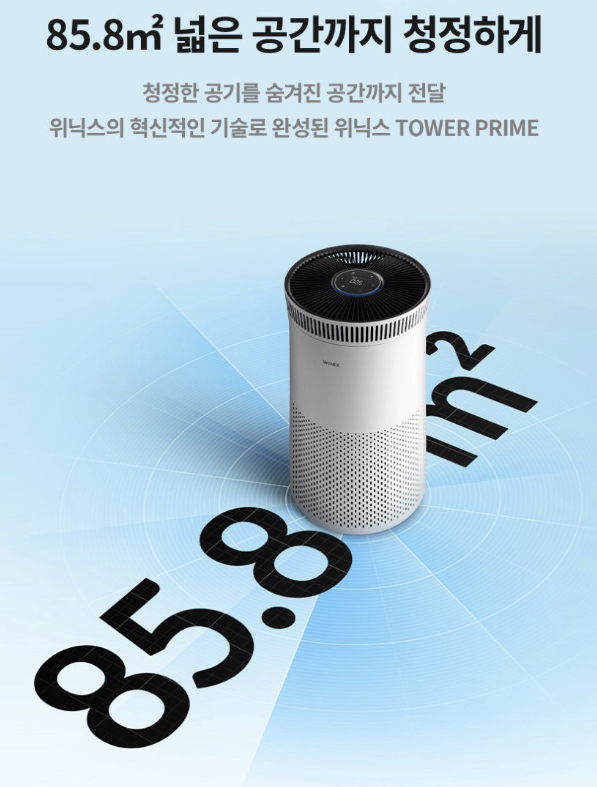 위닉스 타워 프라임 공기청정기의 청정면적은 무려 **85.8㎡**입니다. 이 말은, 넓은 거실이나 큰 방에서도 효과적이라는 뜻이죠.