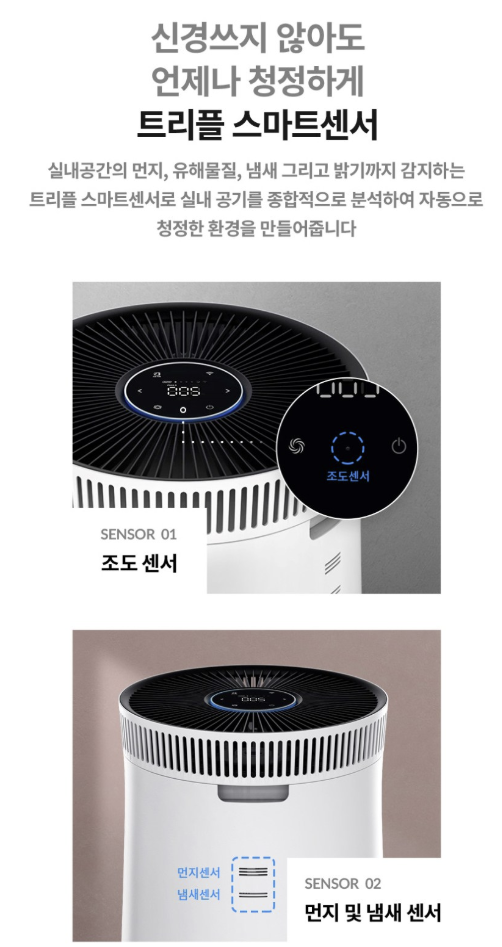 - 미세먼지, 냄새, 온도를 감지하여, 공기청정기 작동을 최적화해줘요.