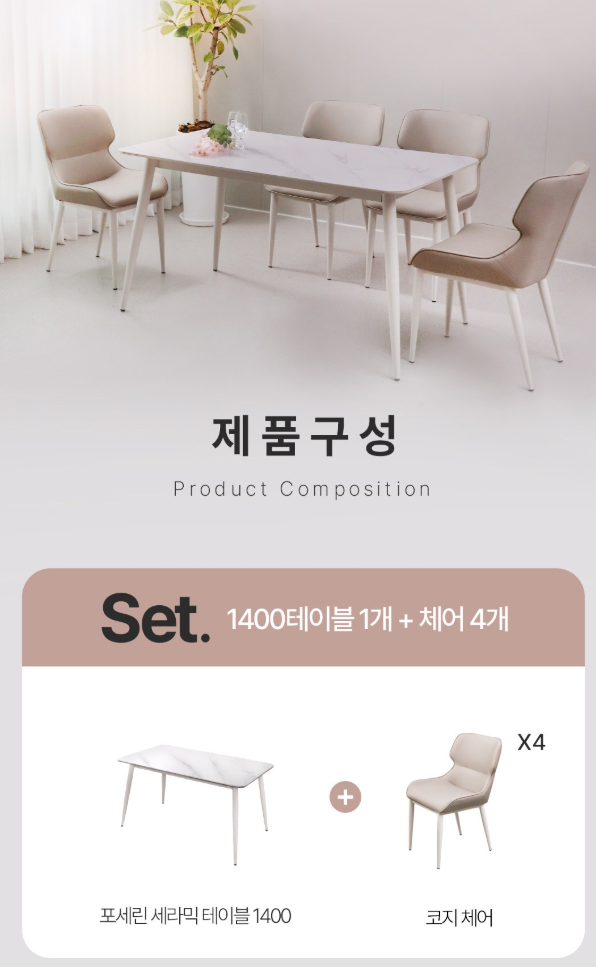 👉 코지라움 화이트에디션 포세린 통 세라믹 식탁세트 1400