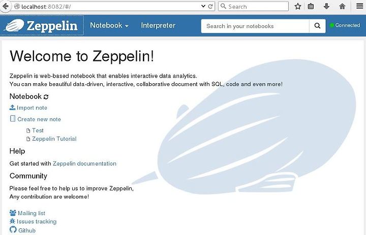 Zeppelin의 웹 화면에서 Notebook - Create new note - Test