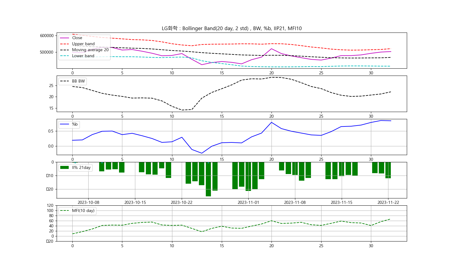 안녕하세요, 두부작가입니다. 오늘은 2023년 11월 22일을 기준으로 한 LG화학 주식에 대한 기술분석을 진행해보겠습니다. 이번 분석에서는 주식의 종가를 중심으로 한 볼린저밴드, 일중강도율(IIP), 현금흐름지수(MFI)를 활용하여 향후 투자 전망을 살펴보겠습니다.