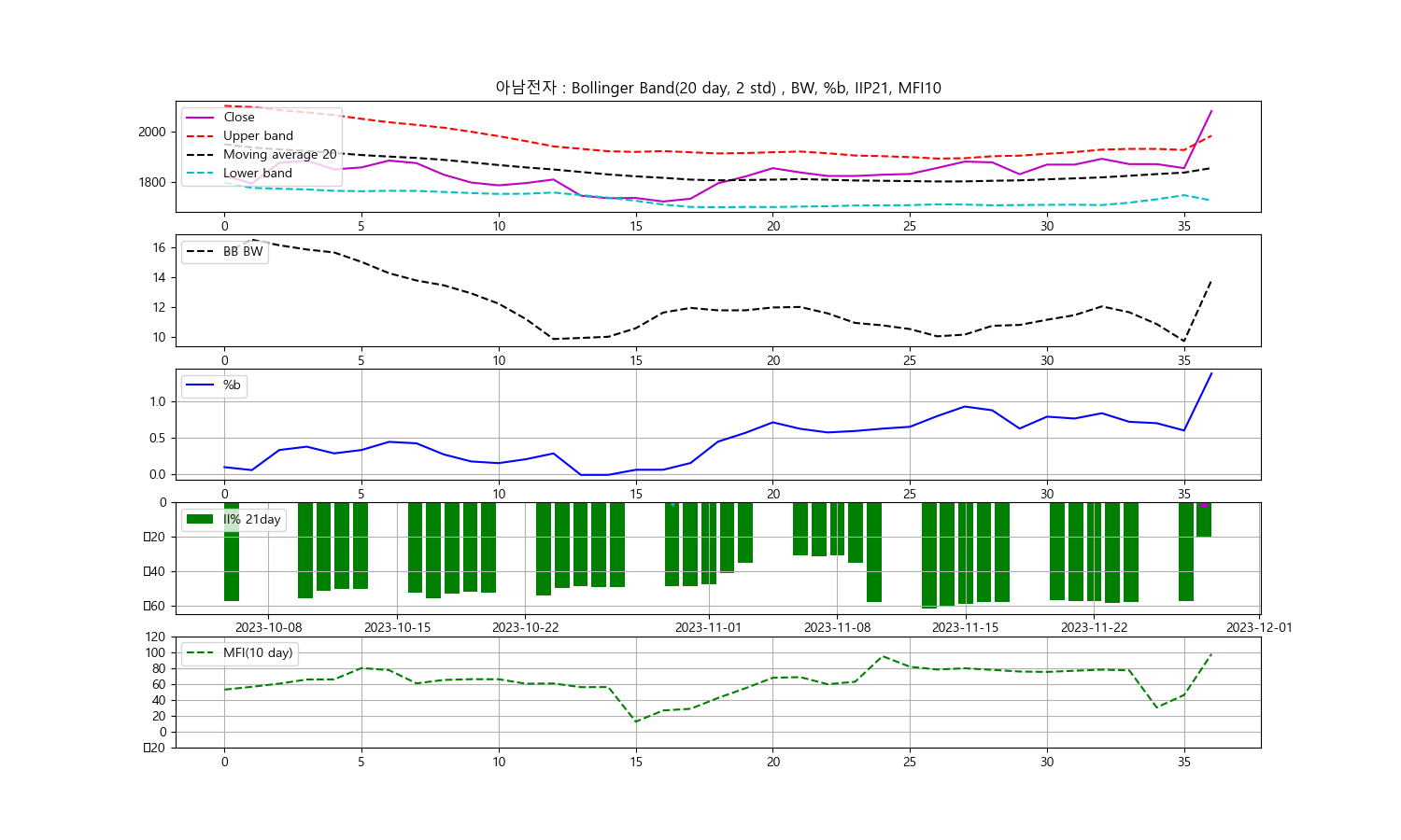 안녕하세요, 두부작가입니다. 오늘은 2023년 11월 28일을 기준으로 한 아남전자 주식에 대한 기술분석을 진행해보겠습니다. 주식의 종가를 중심으로 한 볼린저밴드, 일중강도율(IIP), 현금흐름지수(MFI)를 통해 향후 투자 동향을 알아보겠습니다.