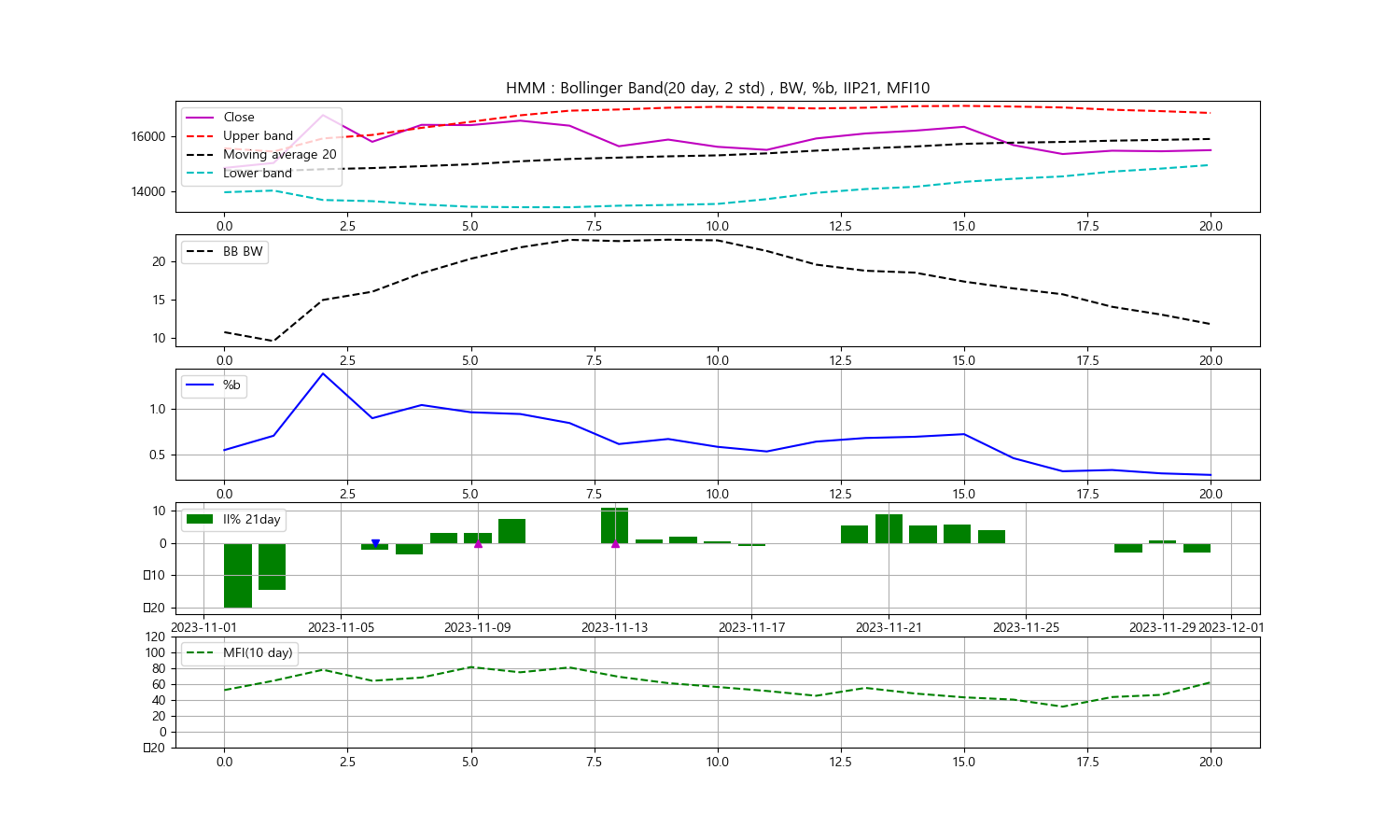 안녕하세요, 두부작가입니다. 오늘은 2023년 11월 30일을 기준으로 한 HMM 주식에 대한 기술분석을 진행해보겠습니다. 주식의 종가를 중심으로 한 볼린저밴드, 일중강도율(IIP), 현금흐름지수(MFI)를 통해 향후 투자 동향을 알아보겠습니다.