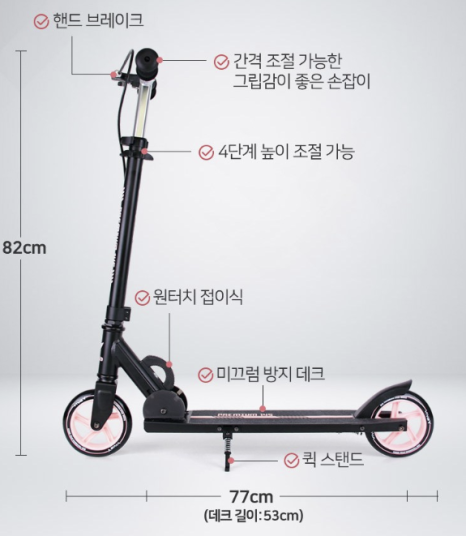 이 킥보드에는 높낮이조절기능이 있어요. 사용자마다 다르게 키에 맞춰 손잡이의 높이를 조정할 수 있어요. 👌